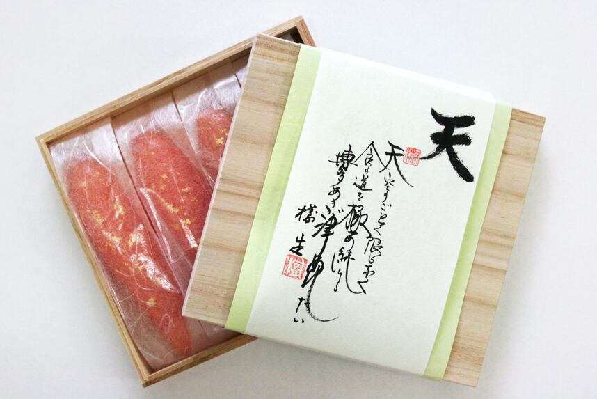 お求めやすい「天」四本売りです。 店主が全てをかけた辛子明太子「天」を一本一本丁寧に包装し桐箱に詰めてお届け。納得のいく真子が入った時のみに作る他に類をみない逸品です。