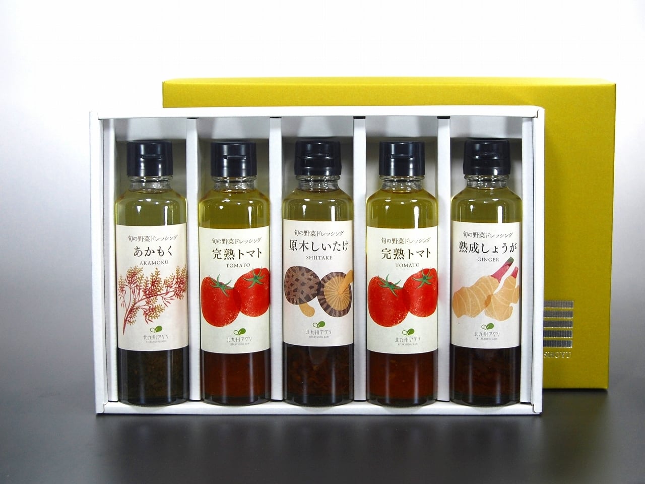 旬の野菜ドレッシング『完熟トマト』『原木しいたけ』『あかもく』『熟成しょうが』の無添加ドレッシング化粧箱入り5本セットです。