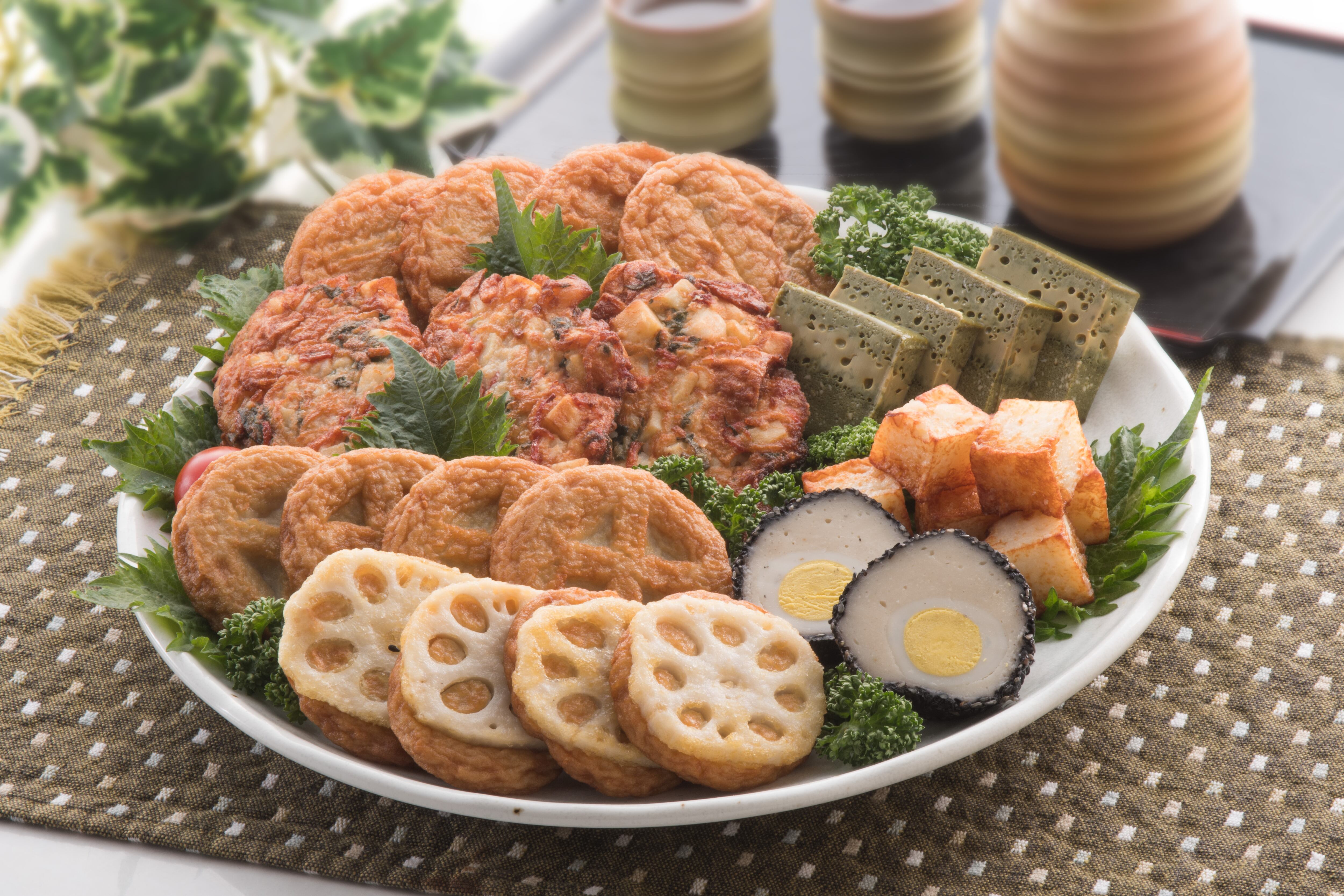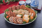 【原材料】魚肉、種物(さつま芋、ごぼう、れんこん、オキアミ、うずら卵、かに風味蒲鉾、黒ごま、しそ、あおさ粉、ごま油、竹炭)、とうふ、砂糖、でん粉、発酵調味料、菜種油、酒(地酒100%(鹿児島製造))、ぶどう糖、食塩/加工でん粉、調味料(アミノ酸等)、着色料(紅こうじ色素)■コガ茶:鶏卵、とうふ、砂糖、発酵調味料、食塩、粉茶、クロレラ、㏗調整剤